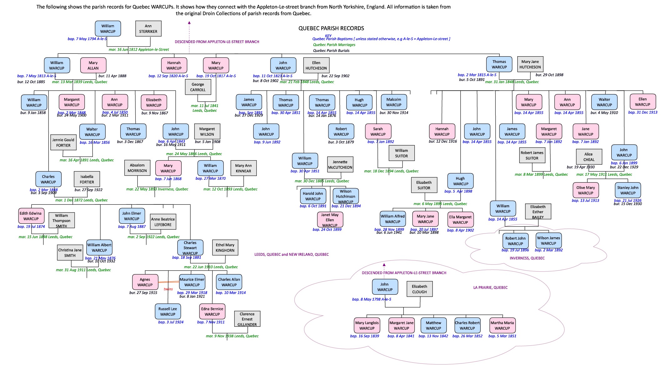 | Note | 2) Profession: - from 1861 canadian census - see below 5) Children: - from 1861 canadian census - see below - from baptism records of children 6) Spouse: - from 1861 canadian census - see below - from baptism records of children =================================================================== The 1861 Canadan census for Laprairie County has the following entry : WARCUP 1861 census @ca.qc.274 page 079 line 08 @ca.qc.laprairie.laprairie_paroise part 2 film C1289 lds0517387 8 WARCUP John m 62 Eng CofE farmer married wood house 9 WARCUP Elizabeth f 45 Eng CofE farmer married 10 WARCUP Mary f 22 Que CofE farmer 11 WARCUP Marguerite f 20 Que CofE farmer 12 WARCUP Mathew m 19 Que CofE farmer 13 WARCUP Arthur m 11 Que CofE farmer 14 WARCUP Charles m 8 Que CofE farmer ditto marks implying cultivateur/farmer occupation for all family members Laprairie County research by Kelly Townsend =================================================================== |