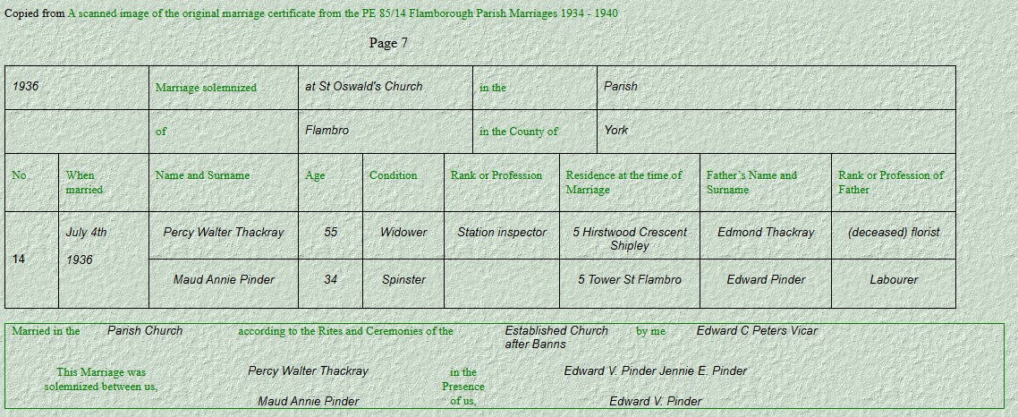 Marriage PE85-14 1936 Thackray - Percy Walter & Pinder - Maud Annie