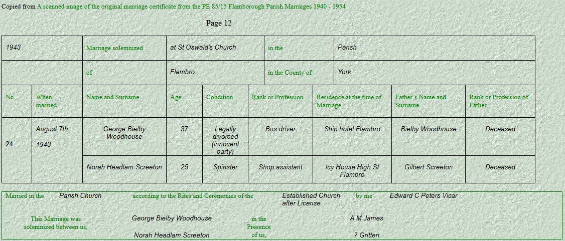 Marriage PE85-15 1943 Woodhouse - George Bielby & Screeton - Norah Headlam