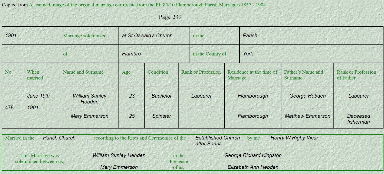 Marriage PE85-10 1901 Hebden - William Sunley & Emmerson - Mary